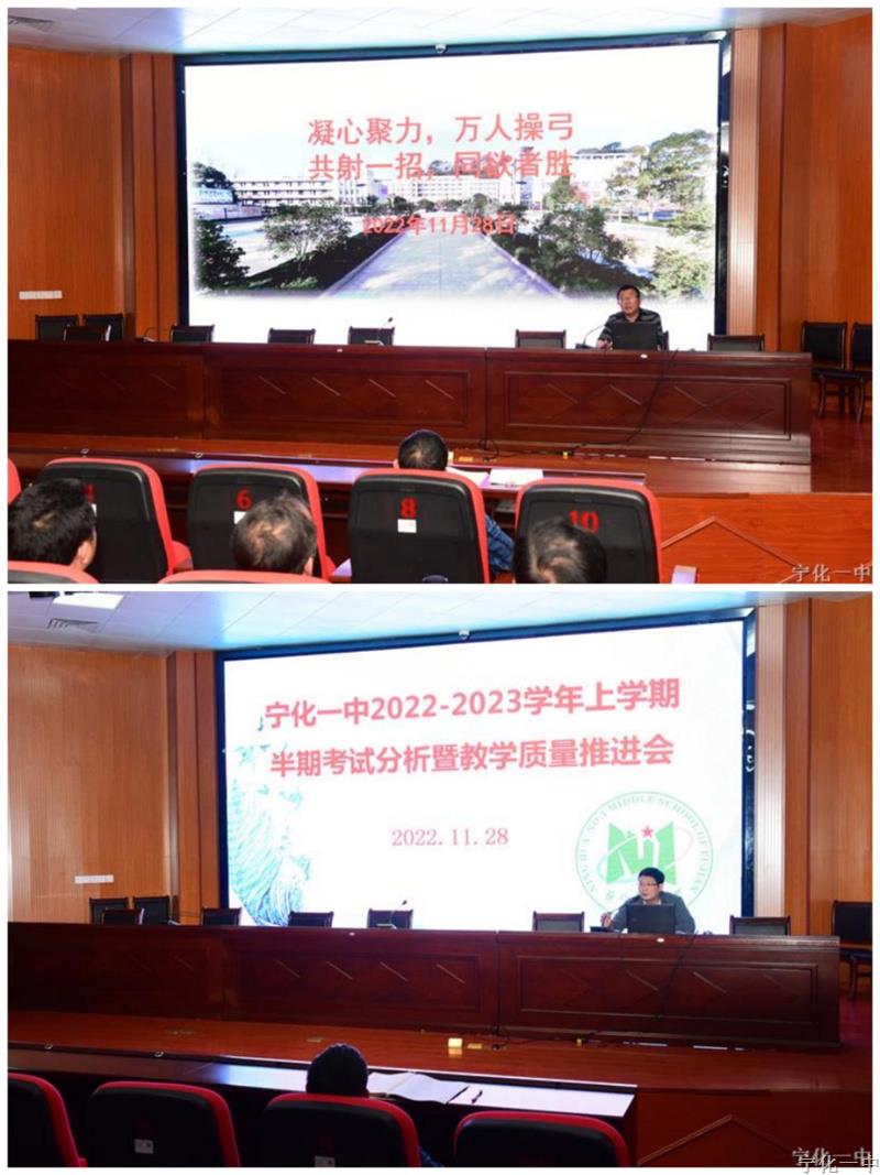 11月28日,在演艺厅我校召开了全校教职工半期考试质量分析暨教学质量推进会。会上,教务处涂海滨主任重点分析我校本学期半期考试情况。涂主任充分肯定了半期联考取得的成绩,同时也指出了各年段存在的一些隐性问题,提出了个人的意见和建议;吴太明校长结合半学期以来学校教育教学情况,就“期末考试新目标”进行分析阐述,要求广大教师要牢固树立三种意识,勉励广大教师为宁化一中永续辉煌,为办人民满意的教育而不懈奋斗。