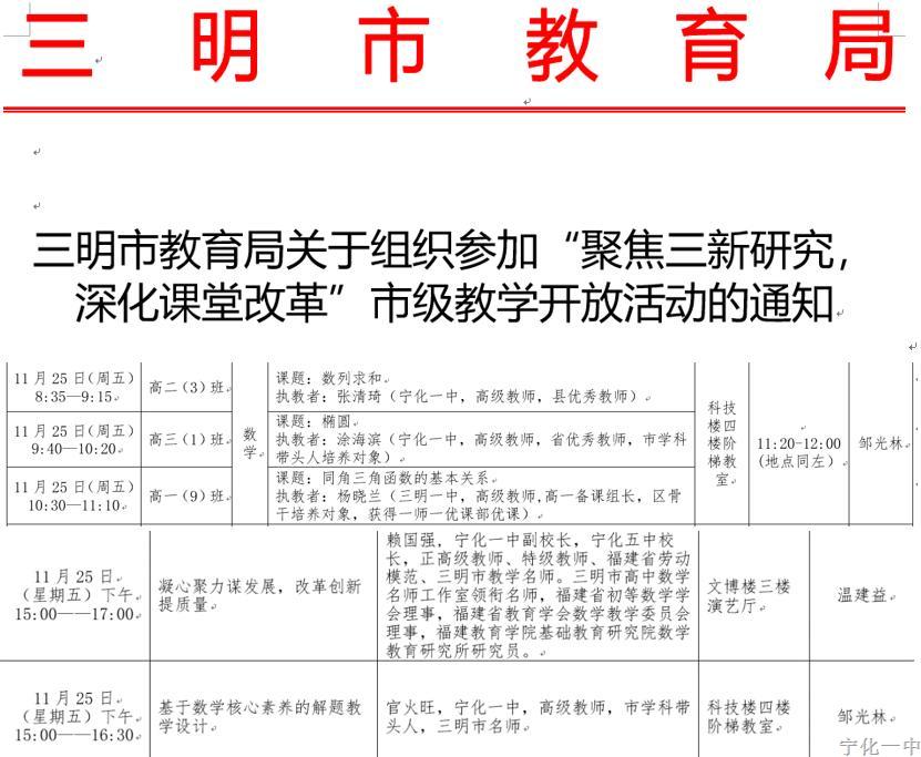 为推动新课程下高中高效课堂的教学研讨,进一步推进我校省十四五规划课题开展,增进校际交流,促进课堂教学模式改革。2022年11月24-25日,宁化一中举行了“聚焦三新研究,深化课堂改革”为主题的市级教学开放周活动。省课题组所有成员全程参与了此次活动。