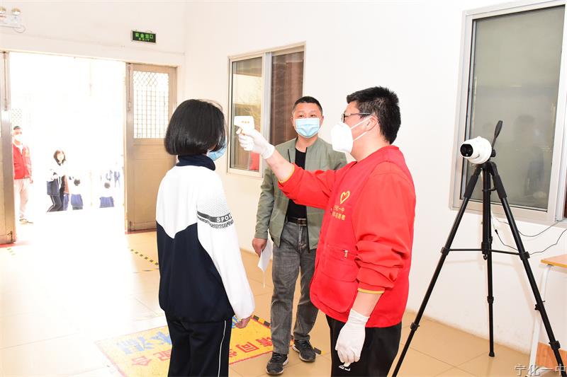 校门口,值日行政、教师、校医、保安一道检查学生口罩佩戴情况,引导学生保持1米以上间距,有序进入测温通道。体温正常学生排队入校,并从指定通道径直进入班级。如发现体温较高学生,转移至临时隔离点,消杀人员即刻对现场进行消杀。经彭永忠校医测量后确认超过37.3摄氏度的学生,由值班老师上报校办联络员,并联系班主任、家长,通知家长到校陪同该生前往医院复查,并由家长将复查结果上报班主任、学校。